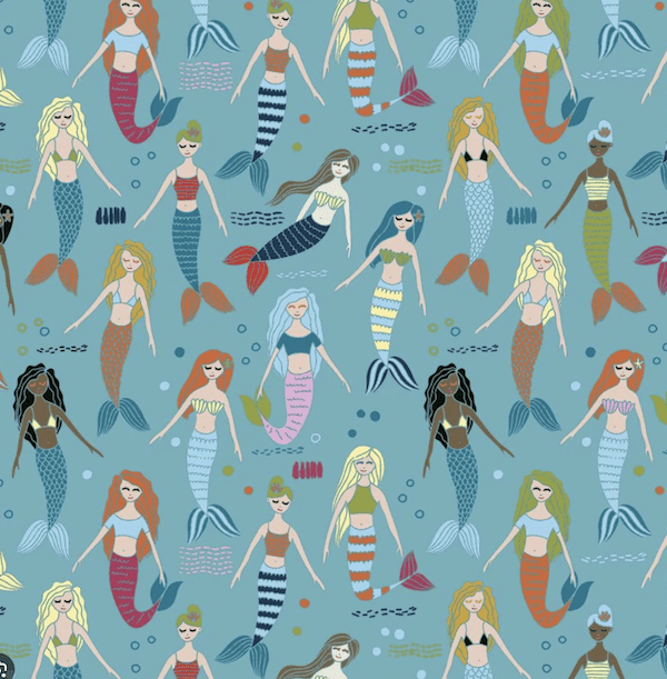 Outside: Multi-coloured mermaids on a dark blue background 100% cotton fabric, Oeko-tex certified.